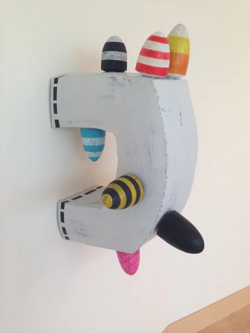 This piece is deceptively light and strong for its size; constructed from sturdy plywood and attached to casters, the viewer can easily rotate the crown or choose to climb in or on it. The pivot point is off-center, creating more dynamic movement that references Venn diagrams.