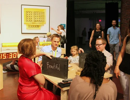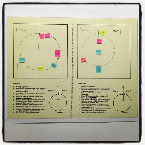 Spectrum consists of three phases: a classroom inspired presentation of word pairings drawn on a large chalkboard, worksheets designed to bring two humans together to create unique combinations and a small group session where participants mark and discuss how they relate to the words and a each other. The interactions challenge a presentation of the world as divisive and binary while promoting a practice of understanding across an infinite spectrum. This work was included in an exhibition at the Museum of Fine Arts and a series of performances around Boston between March and August of 2017.