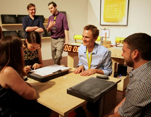 Between Us is a fast-paced collaborative word game, in which the players do not compete against each other, but work together towards the common goal of writing the same thing on their chalkboards. They write the answer to “What is between x and y?” where x and y are variables generated each round by players one and two, respectively. When x = y the players win.